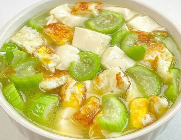 丝瓜豆腐汤 温和清爽,丝瓜含有丰富的膳食纤维,豆腐则是优质蛋白的良好来源。