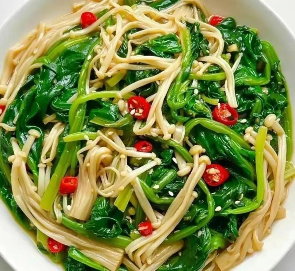 凉拌菠菜金针菇 富含叶酸和维生素C,有助于促进新陈代谢,提高免疫力。