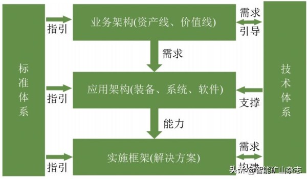 此外,需要建立各框架互联的管理体系以确保业务功能的顺利实现,从而真正做到减员增效,提升现代化管理水平。巴拉素煤矿总体架构由业务架构、应用架构、实施框架、技术体系、标准体系组成(图4)。