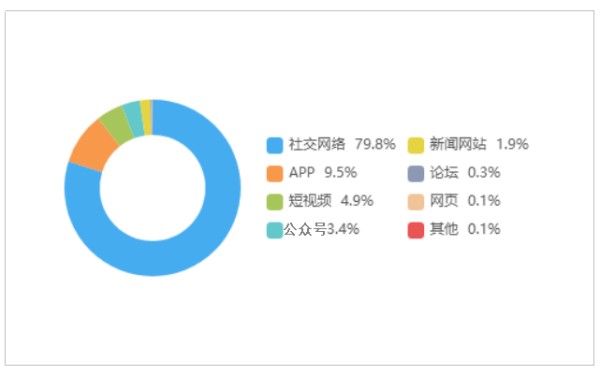 由上图可以看出,有关“小红书破坏网络生态被约谈”的舆情主要集中在社交网络平台,相关舆情量,占总量的79.8%,其次为新闻APP占9.5%,短视频占4.9%。