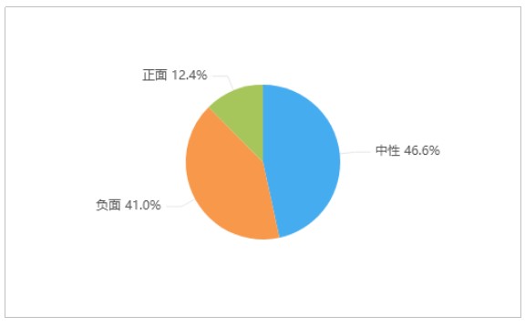 由上图可以看出,关于“小红书破坏网络生态被约谈”的舆情情感倾向,中性舆情占比最多,达到46.6%;负面舆情次之,占比41.0%;正面舆情较少,仅占12.4%。