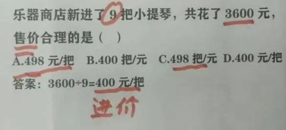 老师解释:这道题之所以选择A,是因为小提琴进价400,400只是进价,合理售价应该比进价高,所以只有选项A正确。