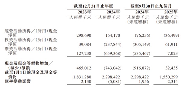 而公司的现金流状况同样不容乐观。招股书披露,2025年前三季度,公司经营活动现金流净额两度为负,其中公司2025年中报发布时,其现金流净流出1.85亿元,尽管三季度末有所回暖,但经营活动现金净额为-3649.9万元,全年现金流压力仍未缓解。