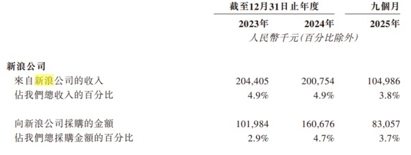 除了业务层面的问题,天下秀的公司治理和合规管理也存在隐患。招股书显示,新浪公司不仅是天下秀的控股股东,还同时扮演主要客户和主要供应商的角色。2023年至2025年前三季度,天下秀来自新浪的收入占比分别为4.9%、4.9%、3.8%,向新浪的采购额占比分别为2.9%、4.7%、3.7%。而关联交易极易引发利益输送质疑。