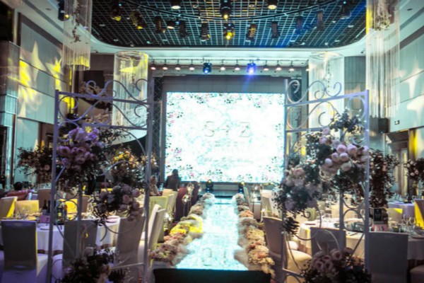 一般婚宴酒店要选择场地开阔的最适合,除非你邀请参加婚礼的宾客很少或者婚礼形式比较特殊。婚礼中要考虑到与宾客的互动和宾客的观赏效果,所以一般有屏风、帷幕或柱子等阻碍视线的都不合适。如果实在无法避免这些因素的话,就要增加观赏设备。