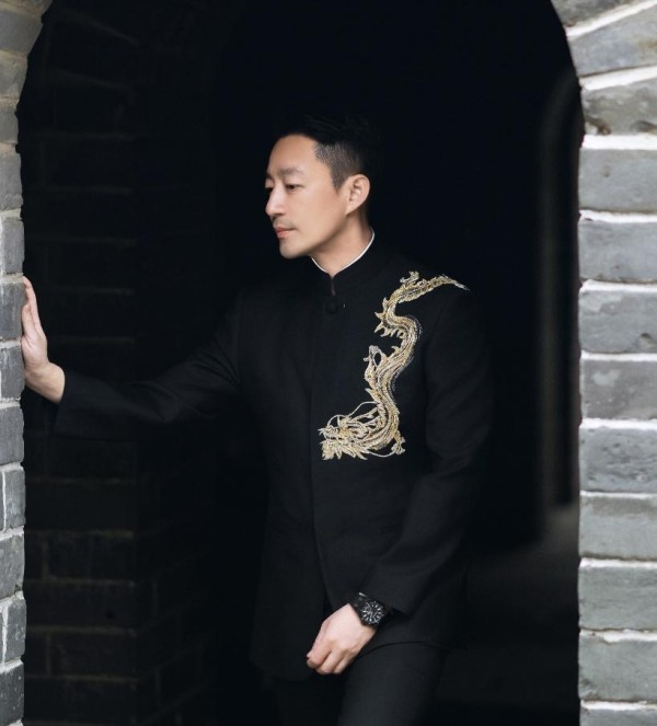 汪小菲穿的是一件中式服装,左侧肩膀上绣着一条金色“过肩龙”。