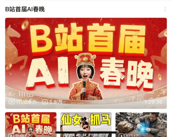 而B站这样的视频社区选择两手抓。一方面,B站知名AI科普UP主“秋芝2046”导演和主持了首届AI春晚,“秋芝2046”联合了站内30位头部AI领域UP主,如“大羽玩AI”“海螺AI官方”“猫大人爱睡大觉”共同制作,内容几乎AI含量百分百,截至26日,该视频播放超过1138万。
