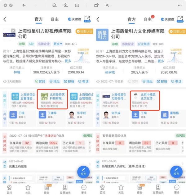2020年8月,恒星引力又与中视鸣达文化传媒合作成立质量引力文化传媒公司。这家中视鸣达文化传媒背后的控股方为抖音旗下量子跃动科技。也就是说,恒星引力有了长视频资方爱奇艺投资后,又引入了短视频字节系的资本。
