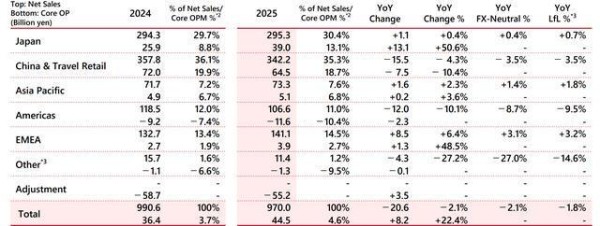 除了核心品牌失守,2025年,资生堂集团在各大区域市场的表现呈现分化态势。