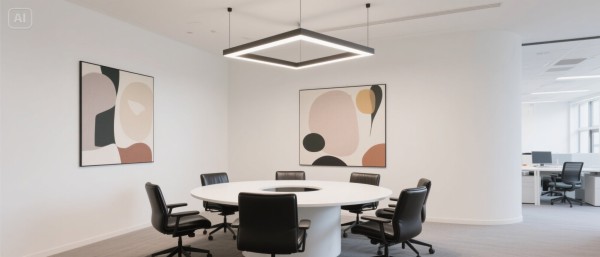 【细节】墙面挂着莫兰迪色系抽象画,天花板有几何造型吊灯