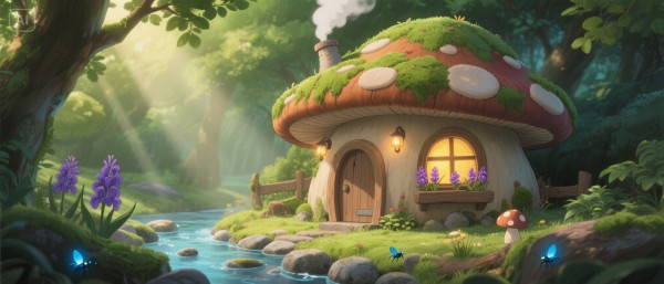 【细节】门前有发光的溪流,鹅卵石上停着蓝色萤火虫;窗户透出暖黄色灯光,窗台上摆着紫色风信子