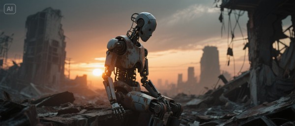 【情感】孤独感:一个机器人坐在废墟上,夕阳照在它生锈的肩膀