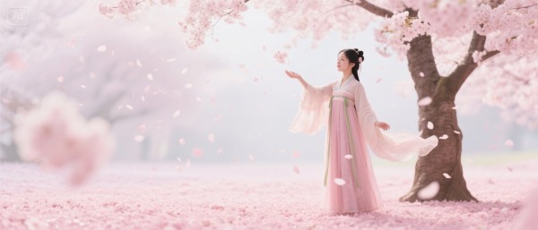【主体】穿汉服的女孩站在樱花树下,伸手接住花瓣