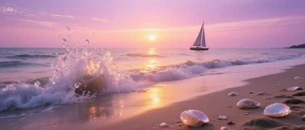 deepseek给出的是:“夕阳沉入海平线时刻,粉紫色渐变天空与金色波光交织,飞溅的浪花凝结成水晶状,沙滩上散落着半透明贝壳,远处帆船剪影划过渐层色海面,长曝光摄影风格呈现丝绸质感海浪,冷暖色调对比强烈,8K超高清细节”