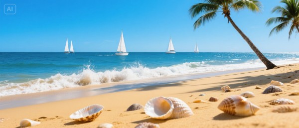 【主体】细腻的金色沙滩上,散落着形态各异的贝壳,海浪有节奏地拍打着岸边,溅起白色的水花,远处的海平面上,几艘帆船缓缓行驶,天空中海鸥自由翱翔。