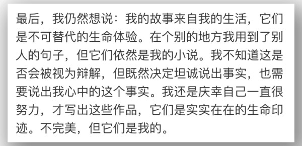 她表示,有些语句在写作时“跳出来”,有时觉得“别人的表达更妥帖,便也用到自己笔下”,并就此向相关作家及读者致歉。