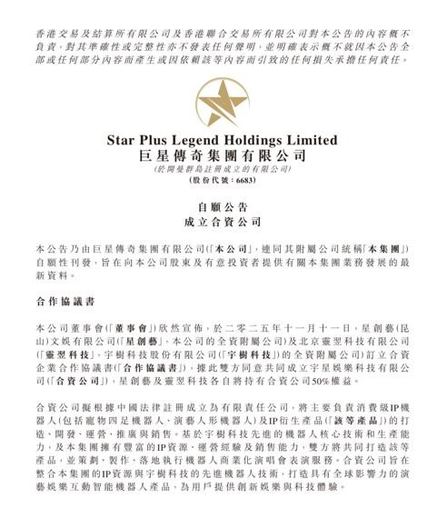 巨星传奇与宇树科技成立合资公司,共拓“IP+机器人+AI”新蓝海