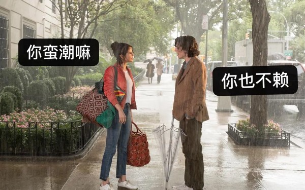 老头子狡猾之处在于,表面反着说,加深了整部电影的反讽。整部电影没有男主角对女主角任何不好的评论,甚至男主看似作为弱势的一方是“陪伴”自己能干优秀的女友来纽约做访谈,全程大夸女主各种优秀厉害,自己无所事事打发时间,可怜地一直等着女主采访结束找他,不料女主由于“工作繁忙”一直忽略着自己,最后男主歪打正着地发现昔日里不怎么留意的一个小姑娘才是和自己心心相惜的真爱。