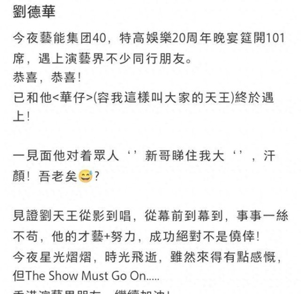 那张大合照,把香港娱乐圈的“老朋友们”又一次拉到同一张画面里——热闹得像过年。1月17日晚,制作人蔡健辉在港办了101桌年会,庆祝艺能集团40周年和特高娱乐20周年。第二天,不少嘉宾把现场图晒上社交平台,刘德华、曾志伟、周润发、洪金宝、黄日华、谭咏麟……光看这些名字就够让人回忆杀满格、心头一热。