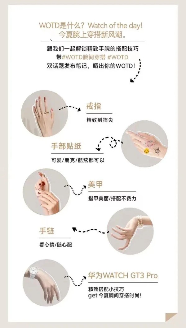 #WOTD腕间穿搭 一经推出,便收获大量小红书用户的关注与参与,简单的饰品搭配完整造型的点睛之笔,吸引着热爱时尚的年轻人们加入这波时尚新浪潮。截至目前,全网曝光量近2.2亿,小红书站内#WOTD腕间穿搭 话题浏览量已经达到891.3万,有诸多网友发布笔记分享自己的“WOTD”,无论是新中式、爱豆风、校园风等不同风格的搭配,亦或美甲、手链、戒指等不同单品,「WOTD」已经与华为Watch GT3 Pro一起,成为潮流新趋势。