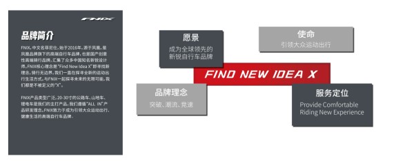 FNIX致力于推广FNIX品牌核心理念——Find New Idea X,即寻找新理念,骑行无边界。智能、科技、创新是未来时代发展的主题色。创新、品质是FNIX品牌发展的持续生产力,FNIX致力于成为引领大众运动出行、健康生活的高端自行车品牌。 [2]