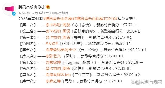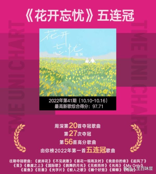 每一个周一,小编都会关注音乐由你榜,目的就是看看周深会有几首歌进入TOP10榜单,2022年第41期也不例外,周深从来不会让我们失望,这一次他有四首歌曲进入前十,更让人高兴地是三首歌曲进前三,《花开忘忧》五连冠。