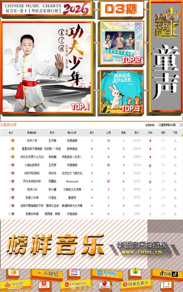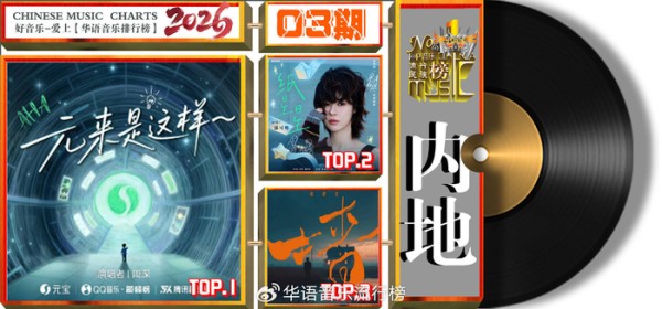 《华语音乐排行榜》2026年第3期“周冠军”分别是张韶涵/周深/阿普萨