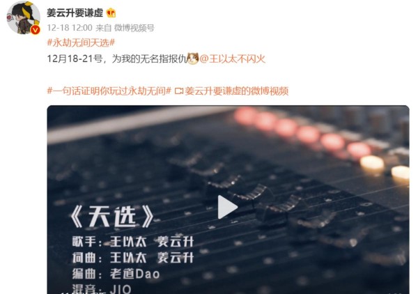 那么姜云升究竟有多爱玩《永劫无间》呢?前不久他甚至联合了同样爱玩这款游戏的说唱歌手王以太,谱写了《永劫无间》画风的专属说唱单曲《天选》,刚上线不久就火遍了全网,还登上了网易云音乐的首页。