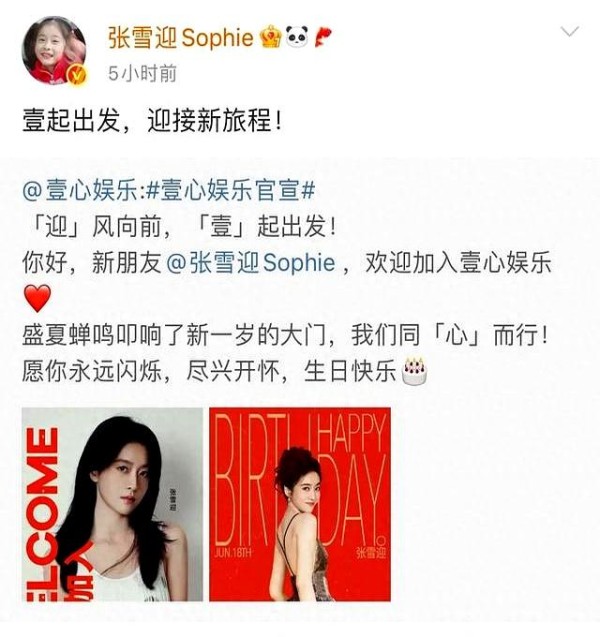 壹心娱乐官宣张雪迎:生日签约双喜临门,演艺新篇章正式开启张雪迎加入壹心娱乐,演艺新程开启!