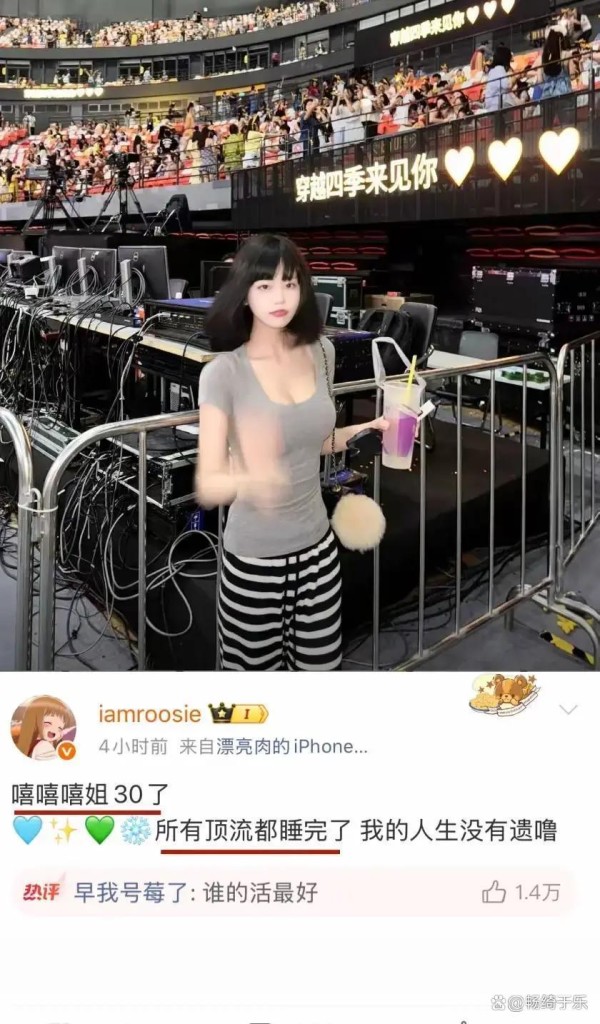 她简单,甚至有些粗暴地在社交平台上说:“人活一世,姐30了,全顶流睡完了,人生无憾。” 没有多余的修饰,坦率得像是车窗外甩来的冷雨。她说完就晒图,不是背影,就是床铺;不是外卖,就是纹身。照片里,她的姿势挑逗,她说的名字更是扎眼,鹿晗、范丞丞、林更新,一个个顶流成了她的名单。