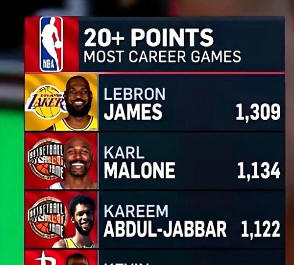 这一夜,他完成了职业生涯第1000场得分20+,成为NBA历史上第四个达成这项壮举的人。