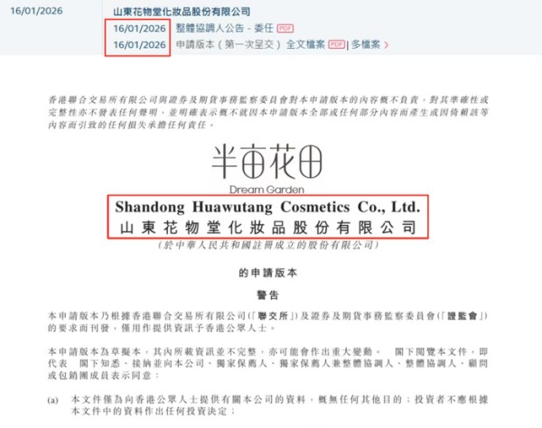 2026年1月,半亩花田的母公司山东花物堂化妆品股份有限公司,正式向港交所递交招股书。