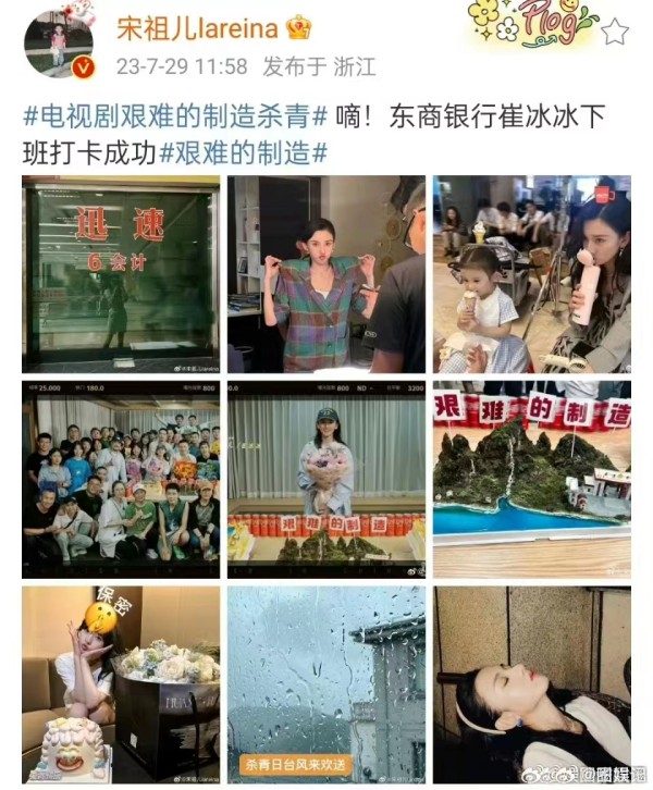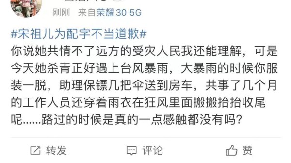 29日,宋祖儿在社交平台上发文庆祝电视剧《艰难的制造》杀青快乐,然而其中的一张配图却引发了网友的争议。在配图中,宋祖儿标注:“杀青日台风来欢送”,这一言论很快引起了众多网友的不满和批评。
