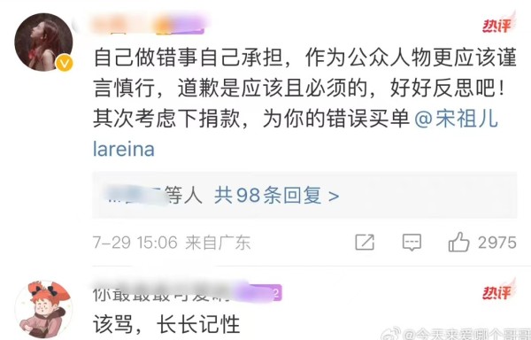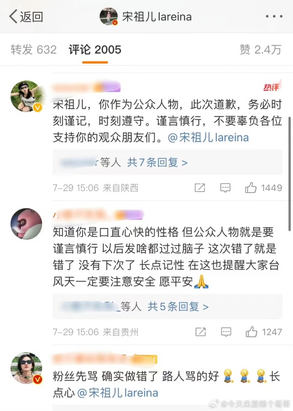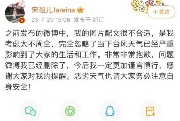 随后,宋祖儿重新编辑发文并且公开道歉。她在文章中表示,“之前发布的微博中,我的图片配文很不合适,是我考虑太不周全,完全忽略了当下台风天气已经严重影响到了大家的生活和工作。非常非常抱歉,问题微博我已经删除了,今后我一定更加谨言慎行,感谢大家对我的提醒。恶劣天气也请大家务必注意自身安全! ”