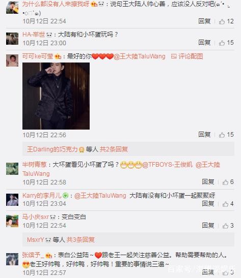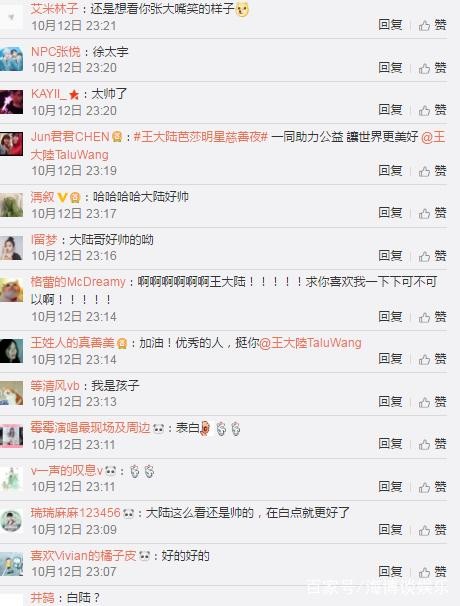 “还是想看你张大嘴笑的样子”“徐太宇”“太帅了”“一同助力公益 让世界更美好”“哈哈哈哈大陆好帅”“大陆哥好帅的呦”“啊啊啊啊啊啊王大陆!!!!!求你喜欢我一下下可不可以啊!!!!!”“加油!优秀的人,挺你”“我是孩子”“表白”“大陆这么看还是帅的,在白点就更好了”“好的好的”“白陆?”