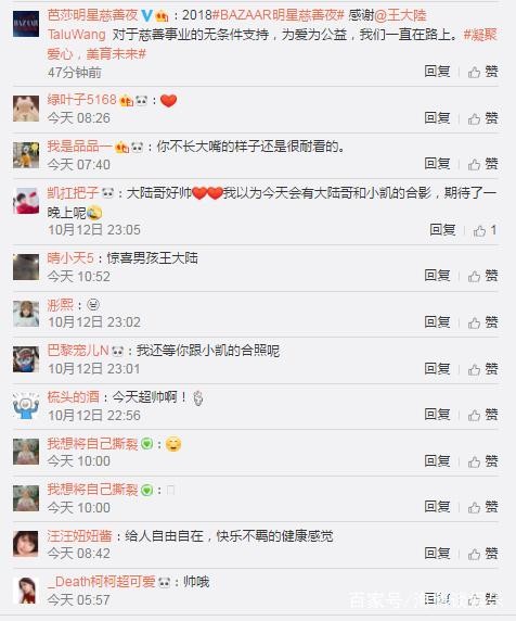 网友纷纷赶来评论:“对于慈善事业的无条件支持,为爱为公益,我们一直在路上。”“你不长大嘴的样子还是很耐看的。”“大陆哥好帅 我以为今天会有大陆哥和小凯的合影,期待了一晚上呢”“惊喜男孩王大陆”“我还等你跟小凯的合照呢”“今天超帅啊!”“给人自由自在,快乐不羁的健康感觉”“帅哦”