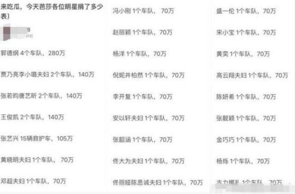 我们看到不乏跑去蹭热度曝光的明星,我们看到明星的捐款明细,其中捐了最多的当属郭德纲郭大爷280万,这个主持人当得很称职,其次是贾乃亮和李小璐夫妇140万。张若昀、唐艺昕140万,王俊凯140万,张艺兴105万,其他明星统一70万。
