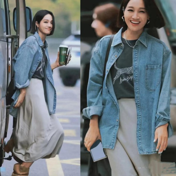 牛仔衬衫呈现出门稍宽松的状态,它归属于那种具备着更为松弛以及更大气特质的穿搭类型。其颜色是经过做旧处理的牛仔蓝,这种颜色完全不存在挑人的情况,当它契合上那洋溢着明快之色的笑颜时,着实实在是太迷人了。