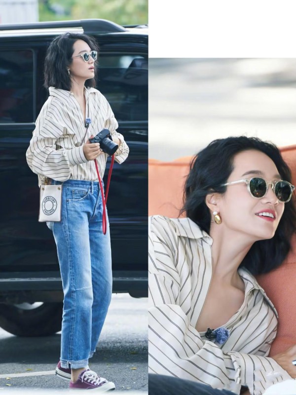 要是你手头现今有那么一件条纹样式的衬衫,同样能够如同朱丹采用的那般,用来加以映衬直筒形态的牛仔裤。这衬衫以及牛仔裤,原本就是达到了严丝合缝般完美契合的组合。