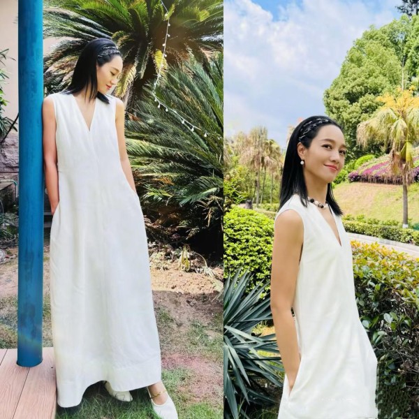 无袖的那种背心,具备捏褶设计的西装裤,二者同样都隶属于白色系范畴,呈现出的是一种有着干净特质且大气的美好模样。像这般的穿搭情形,实在是极其彰显气质的。