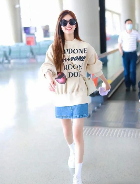 赵露思这套穿搭很适合早秋,颜色清新又甜美。上半身是米黄色的套头卫衣,衣服版型宽松,显得人娇小可爱。胸口有大写的黑色英文字母装饰,还有一个红色的图案,整体给人以简单干净的舒适感。下半身搭配一条蓝色牛仔短裙,露出一双白皙的腿,太羡慕了。脚上一双小白鞋搭配白色的中筒袜,学生气十足。这套穿搭减龄又可爱,超级适合入秋哦。