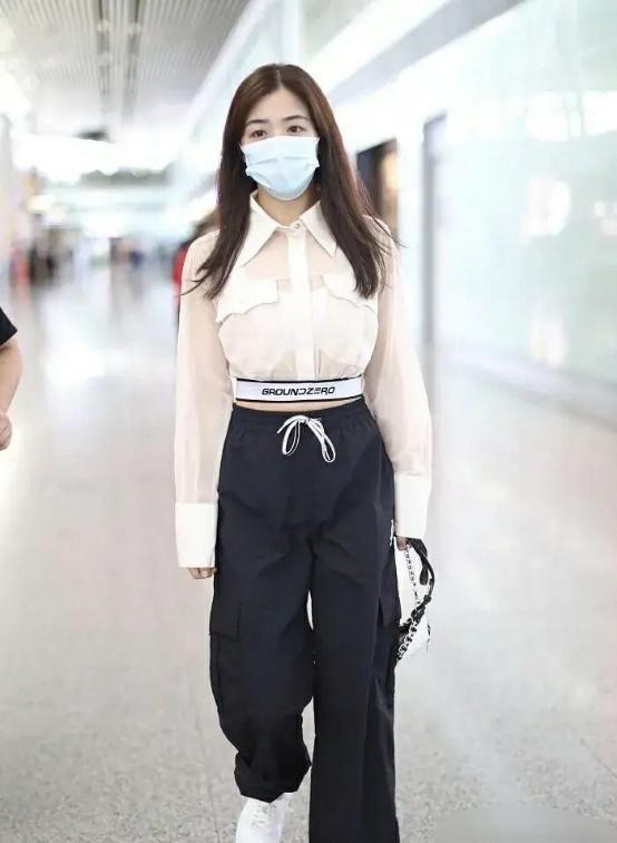 张含韵这套穿搭也是很招人喜欢的,上半身里面是一件白色背心,外面罩一件半透明的衬衫,衬衫的袖口和领口是白色的拼接,增加质感,衬衫下衣角贼接白色松紧带,带有收腰露脐的设计,带着几分性感。下半身是一条黑色的工装裤,裤头有白色抽绳设计,脚上一双小白鞋,休闲又慵懒,露脐装还带着几分性感。