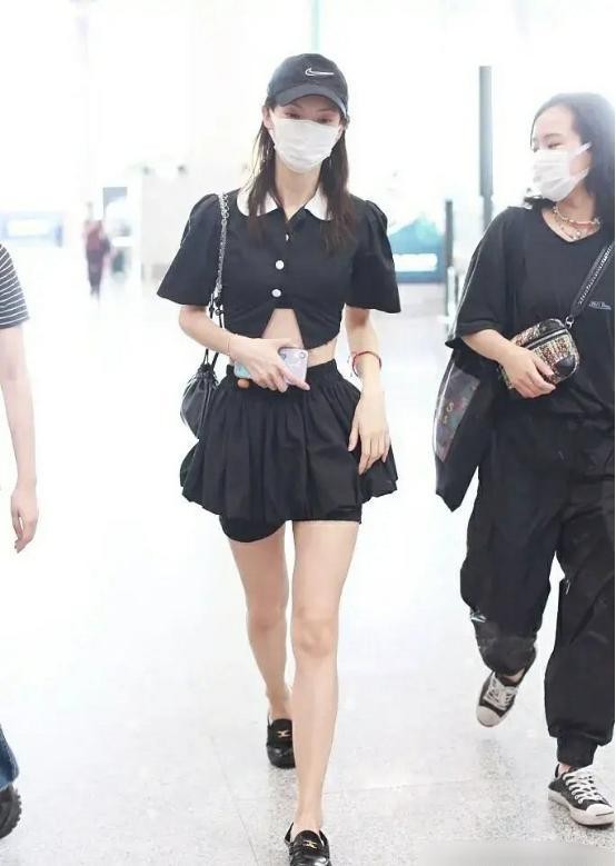 图中这套穿搭,上半身是一件娃娃领的开衫,整体是黑色为主,搭配白色的娃娃领和白色扣子装饰,露脐的短款,只扣一颗扣子露出下面平坦的小腹,太心机了!下半身搭配一件黑色的超短裙,裙子底下还有黑色的打底裤露出来,个性又时尚。脚上一双黑色的尖头鞋,显得脚腕又细又白,真的好羡慕她们的腿。