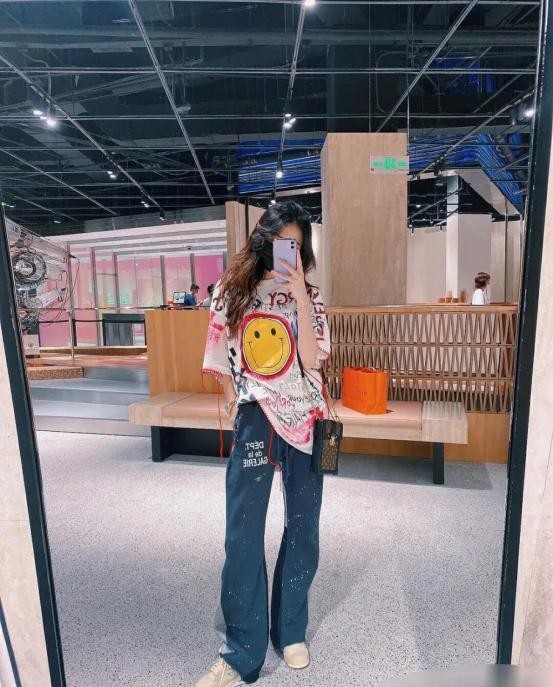 上面这套穿搭会比较偏街头风格一点,比较活泼。上半身的粉白色T恤带涂鸦和大笑脸,街头风的感觉浓厚一点。宽大的五分袖和BF风格的版型,显得慵懒又舒服,袖子处还有红色的垂线装饰,增加嘻哈感。下半身是一条深蓝色的阔腿裤,裤子上有白色的星星点点装饰,就像把星空穿在身上,太绝了!