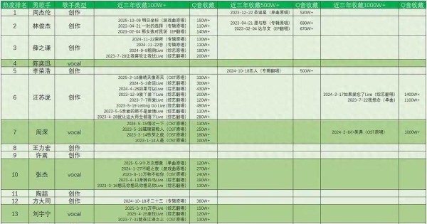来分享个挺有趣的数据,看看华语乐坛里那些主流歌手近三年里,哪些单曲火出了圈,主要想让大家瞧瞧歌手们之间的实力差距到底有多明显。