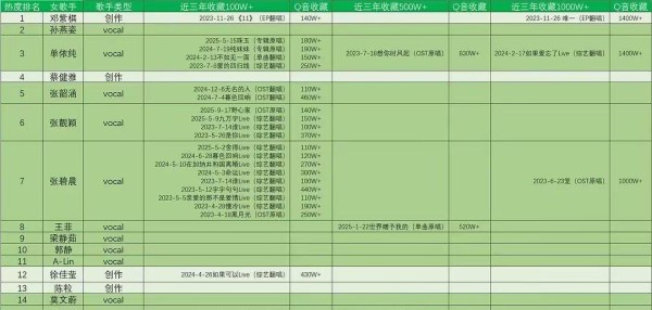 现在说说女歌手的情况,她们这边情况挺明了的,数据一看就懂,毕竟多数女歌手的数据都不咋出彩。