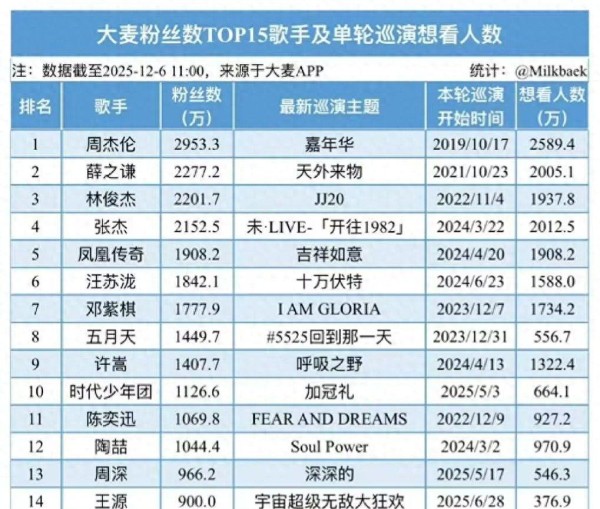 这就是大麦平台上粉丝数量的排行榜!看看这个榜单,就能了解歌手的真实影响力,接下来,咱们一起瞧瞧!