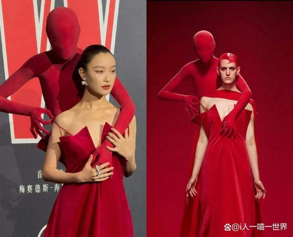 礼服是大牌高定。红色抹胸裙,剪裁立体。最特别的是,背后多了个“假人”模型。白色胳膊,一只环住她肩膀,一只拽着裙摆。像什么?像背了个大活人。更像是药盒里那只“布洛芬小红人”,一秒变成社畜续命表情包。