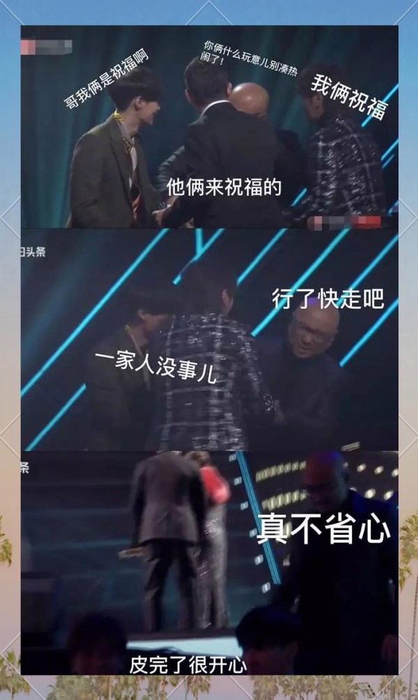 而徐峥与陶虹的恩爱展现,在于徐峥对陶虹的坚定守护。在某次颁奖典礼上,陶虹与黄磊共同荣获年度实力演员,两人携手走上领奖台。此时,张艺兴和罗志祥也一同上台,似乎有意“捣乱”。主持人试图维持秩序,但在合影时却无奈地让他们两人一同站上,场面显得有些混乱。此时,徐峥果断地冲上台,将张艺兴和罗志祥“请”了下去,维护了陶虹的领奖尊严。