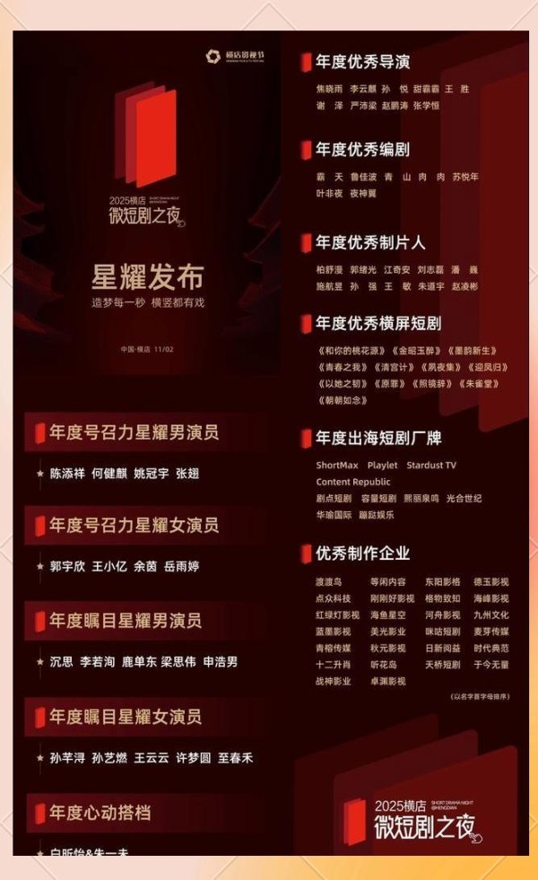 与此同时,主办方在午夜时分透露消息, 横店将在明年投入5亿资金扶持微短剧创作。这5亿资金,不仅让当前的获奖者欢欣鼓舞,更让未来的创作者充满了期待。